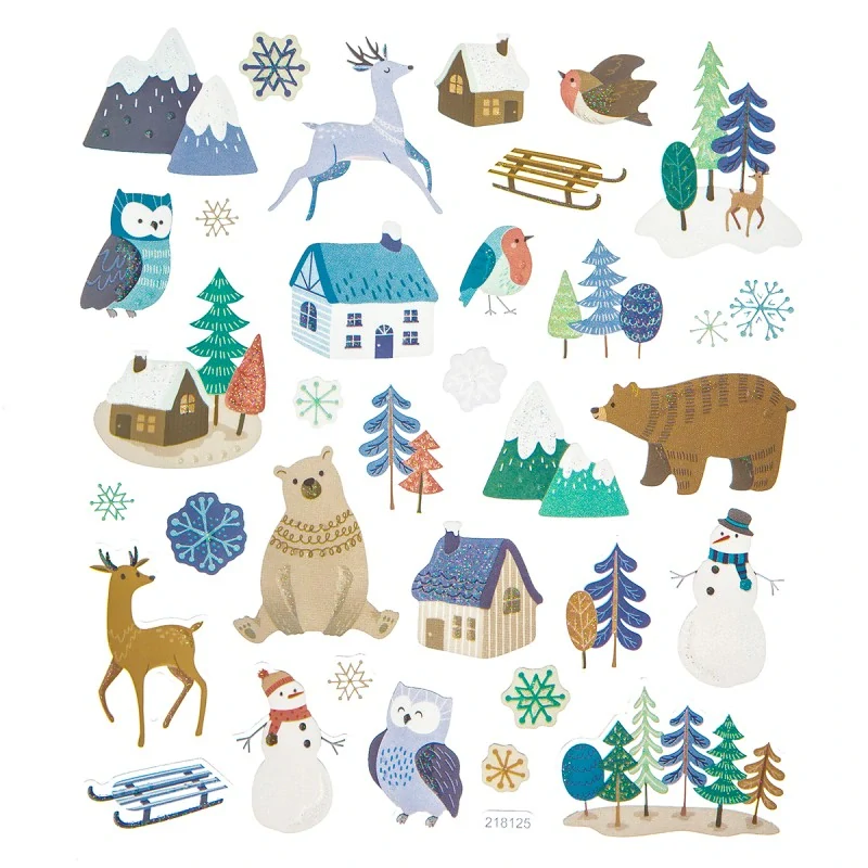 Samolepky papírové DPNK-112 zimní krajina DP - 33 ks papírových samolepek, velikost samolepky cca 1,5-4 cm, rozměr archu 15 x 17 cm
